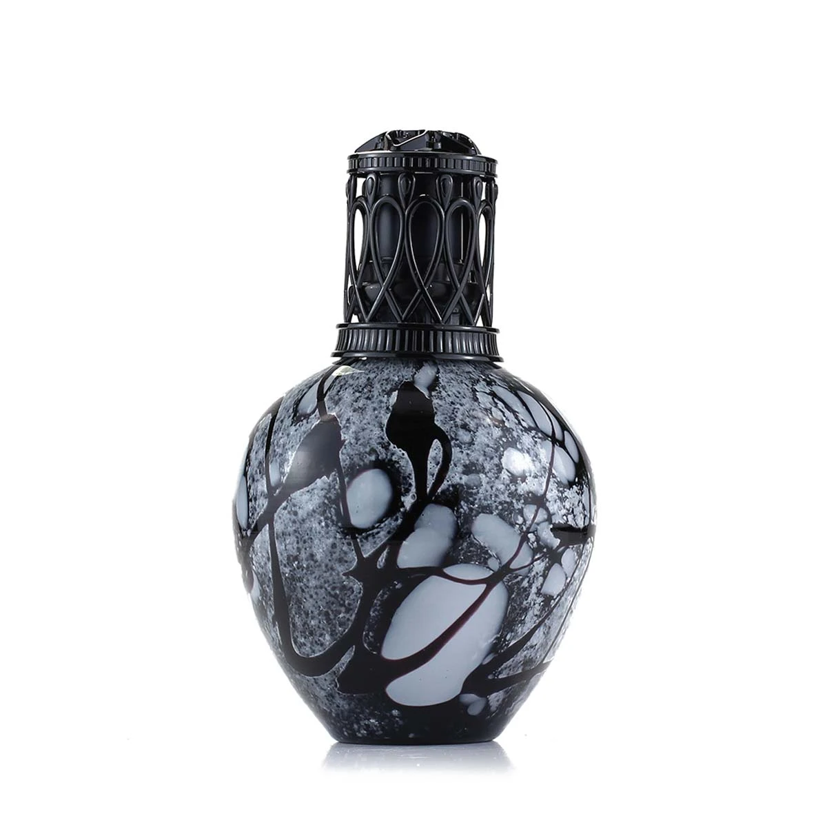 A truly remarkable fragrance lamp, which will add a touch of spontaneity to any room, with black as its canvas white glass mottles through whilst the red streaks across creating a marble effect that will have everyone in wonder. The lamp is finished off with a black decorative crown.
