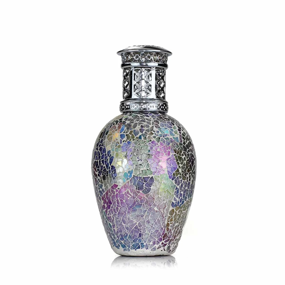A heavenly collection of cool blue, aqua and lilac glass mosaic pieces merge in this classic shaped lamp, to create a breath taking effect. The lamp is topped with a silver coloured fretwork cap.